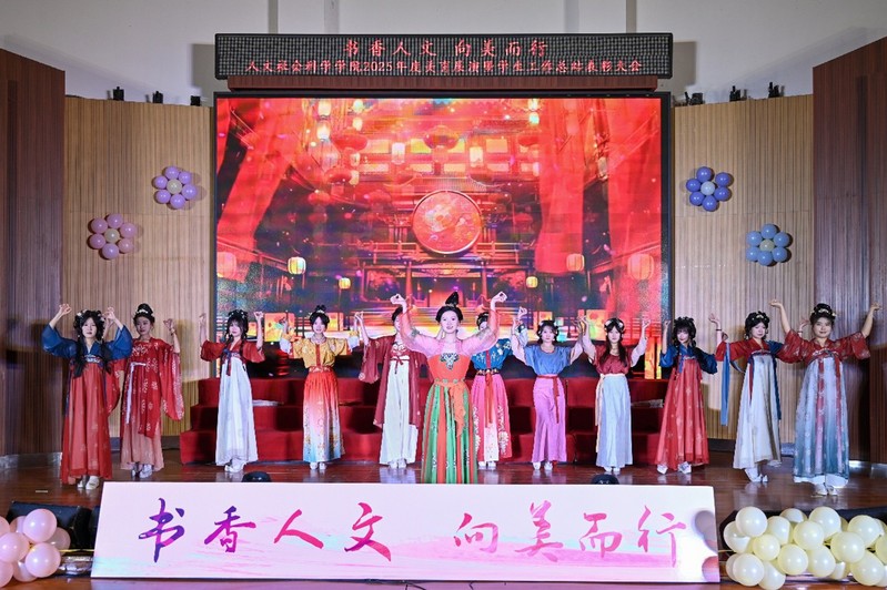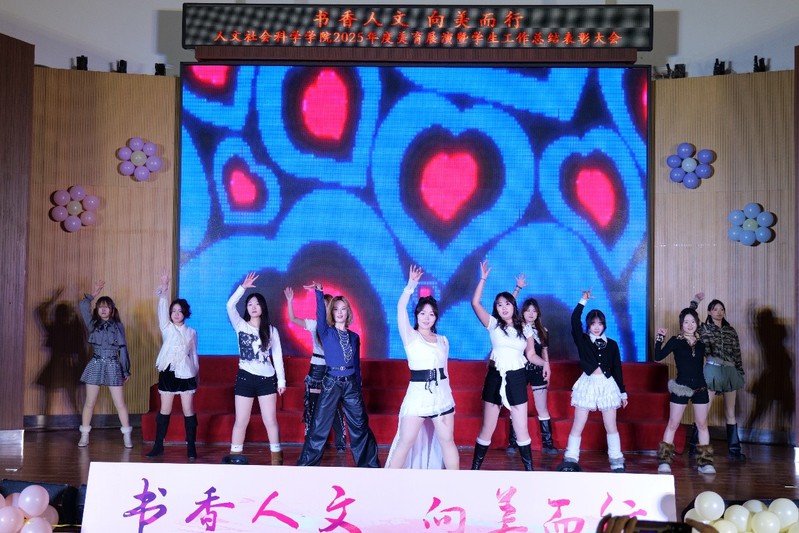 伴随着热情洋溢的舞蹈,美育展演正式拉开帷幕。会上播放的年度工作回顾视频,串联起学院员工工作的各项亮眼成绩与温暖难忘的瞬间,带领在场师生共同重温了这一年深耕不辍的历程与满载而归的喜悦。舞台上,精彩纷呈的节目尽显学院美育工作丰硕成果。学院合唱团带来《一荤一素》《珊瑚颂》《You raise me up》《北大荒人的歌》,悠扬的和声与饱满的情感,彰显了合唱团两年磨一剑的扎实训练成效;《第一天》《一起走》《青春派・舞飞扬》三支舞蹈活力四射,诠释着新时代青年的蓬勃朝气;独唱曲目《我只在乎你》,深情款款,唱出了优秀学子对学校、学院以及恩师同窗的真挚情谊;作为学院美育特色节目,文化礼仪秀《礼诗互伴 绮梦长安》别出心裁,将中华传统礼仪与剪纸艺术、模特表演等元素巧妙融合,以雅致的表演形式赢得全场师生称赞。